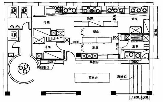 不能設計為獨立的工作間時,也要有相對獨立的功能區(qū)域。可以采用無形的隔斷,例如用冰柜、碗柜、水池排列形成墻,利用設備圍攏形成工作區(qū)間。結合實際情況靈活應用,可以,增加自然的采光亮度和通風效果,使工作間寬敞明亮。即使廚房處在沒有自然采光的位置,減少隔斷,或用透明度好的玻璃隔斷,也有利于照明和視距,節(jié)省照明用電便于通行、協(xié)調和管理。圖5-6是一個小餐館的廚房的設計圖紙,由于使用的設備比較多,采用了部分無墻隔斷設計。為保持衛(wèi)生潔凈,在主食加工間、涼菜間設計了隔斷,涼菜間設計了涼菜出餐口,便于出餐,也保證了清潔衛(wèi)生。涼菜間隔斷可阻擋油煙廢氣、清潔美觀,也隔斷了客人從涼菜出餐口向內觀望的視線。消洗、傳菜間采用了無墻隔斷,使功能區(qū)域分割清楚,又便于配合工作。