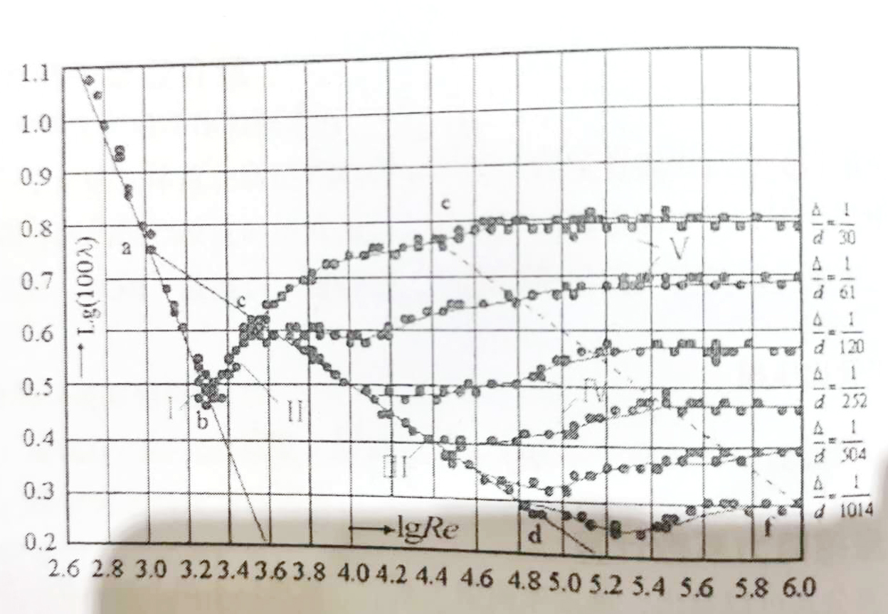 IV區(qū):紊流過渡區(qū)。隨著雷諾數的增大,各種不同粗糙度的曲線開始離開cd曲線,摩擦阻力系數逐漸增大,當增加至圖中虛線位置時各曲線開始與lgRe軸平行。在cd線與虛線中間的區(qū)域為第Ⅳ區(qū)。該區(qū)摩擦阻力系數可用柯列勃洛克公式計算。