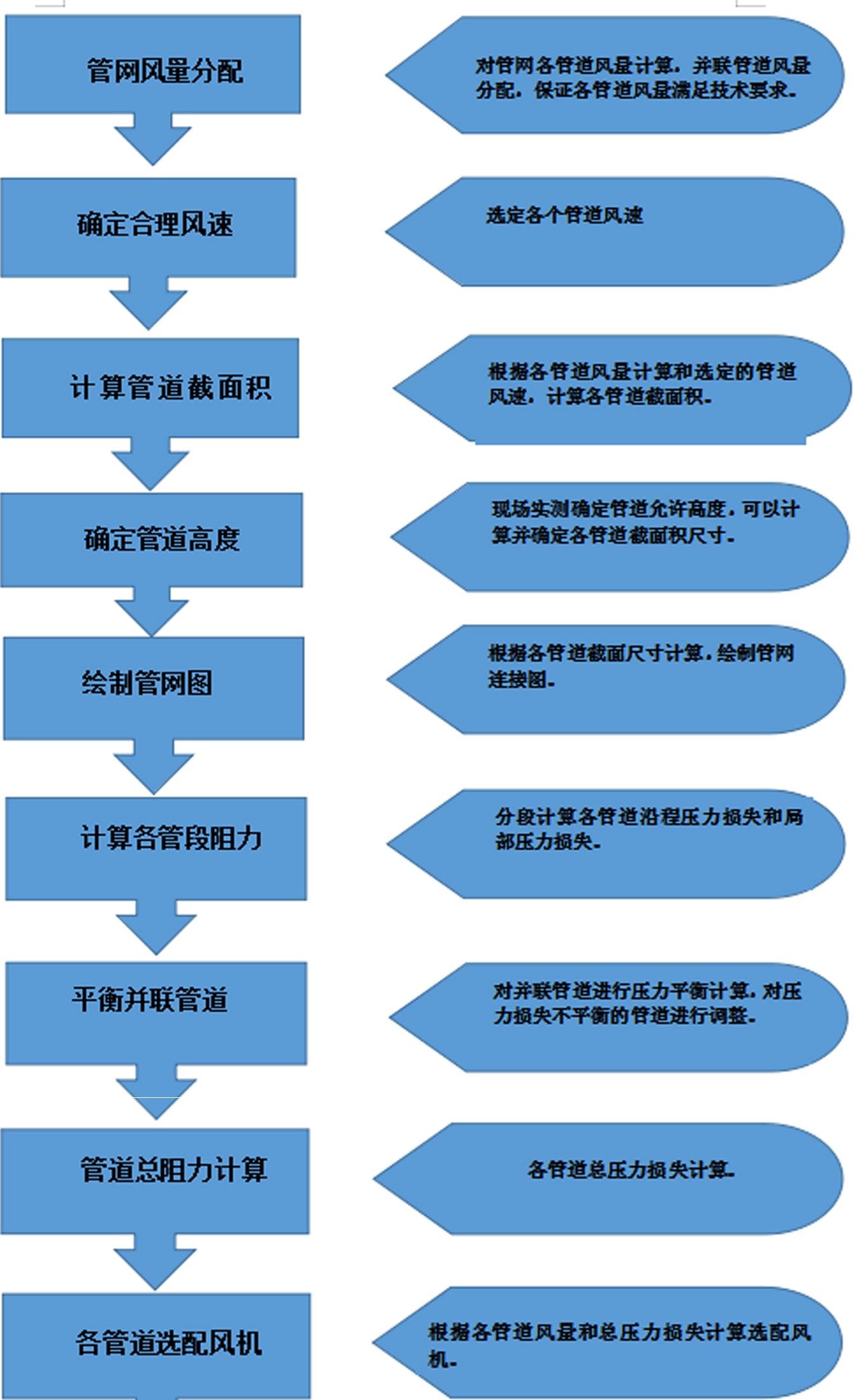 在完成管道排風(fēng)量計(jì)算、管道布設(shè)后、開始管道設(shè)計(jì)計(jì)算,可按以下步驟進(jìn)行。請(qǐng)見下圖。