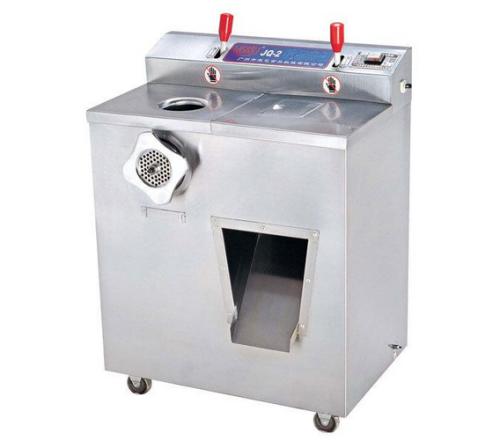 絞肉機由機架、傳動部件、絞軸、絞刀、孔格柵組成。機架為一箱體,傳動也很簡單,電動機輸出皮帶輪經(jīng)一級減速,把動力傳遞給絞軸旋轉(zhuǎn)。絞軸是一根螺旋推進軸,用以輸送肉塊。絞刀連同絞軸一起旋轉(zhuǎn),在絞刀與軸之間有剪切柵板。絞刀另一側(cè)是輸出肉餡的孔格柵。使用時要把肉分割成小塊并去皮去骨,再由入口投進絞肉機中,啟動機器后在孔格柵擠出肉餡。肉餡的粗細可由絞肉的次數(shù)來決定,反復(fù)絞幾次,肉餡則更加細碎。該機還可用于絞切各類蔬菜、水果、干面包碎等,使用方便,用途很廣。