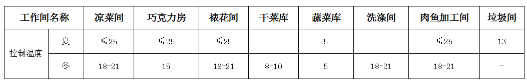 在規(guī)范中對工作專間有明確的定義:“指處理或短時間存放直接入口食品的專用操作間包括涼菜間、裱花間、備餐專間等?!蔽覀冞@里的專間包含了其他專用工作間。各種專間溫度控制參照規(guī)范的要求和一般做法。設(shè)計人員要結(jié)合實際提出設(shè)計要求,例如.大型食堂和快餐店,在就餐準備之前有大量的食材要加,特別是魚、肉、禽、在室溫下擱置較長時間,不能隨時進行冷藏保鮮,夏季對室內(nèi)的溫度就要嚴格控制,或增加保鮮設(shè)備的容積、便于及時冷藏,防止經(jīng)過浸泡、擇洗、改刀的食材變質(zhì)。嚴格控制各區(qū)溫度和濕度是控制微生物生長、保證食品安全的關(guān)鍵。不同區(qū)域環(huán)境有不同的溫度和濕度要求。主食庫、調(diào)料庫、干品庫只要控制濕度,各加工區(qū)需要控制溫度,見下表