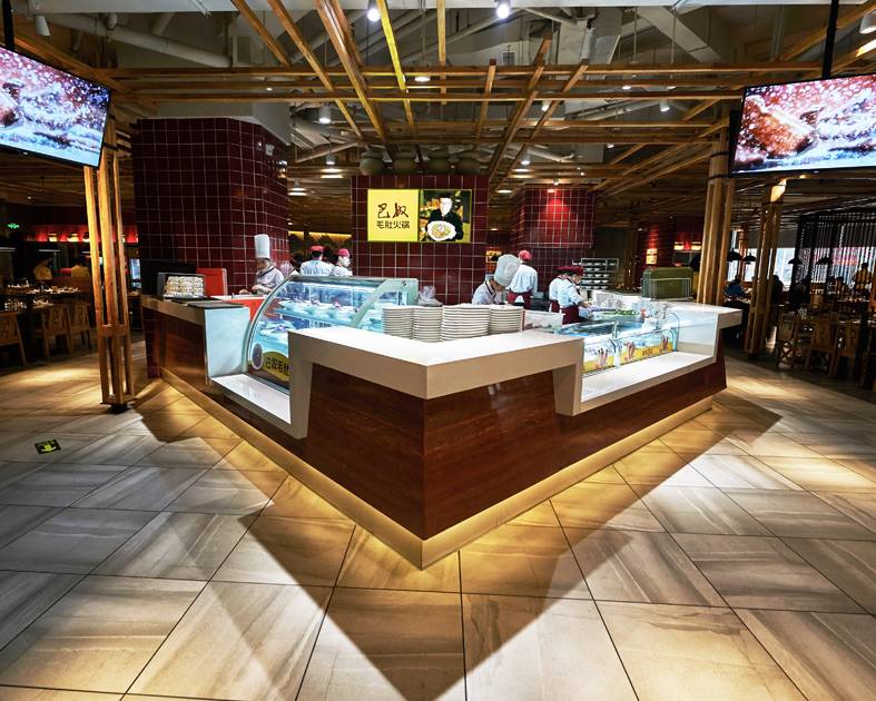 “點(diǎn)菜區(qū)”為了讓客人一目了然,在餐廳設(shè)立點(diǎn)菜區(qū),設(shè)置點(diǎn)菜柜、風(fēng)幕柜、熟食柜、冷藏展示柜、海鮮魚缸、貝類池等展示實(shí)物,使顧客可以親眼看到菜品或主輔料。這種“菜單式明檔”,也是一種開放的方式,占用的空間有限,中小酒店都可以應(yīng)用。