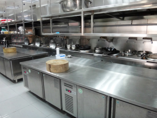 3、儲(chǔ)藏設(shè)備:其分為食品儲(chǔ)藏部分,包括常溫和低溫設(shè)備:平板貨架、米面柜、打荷臺(tái)冰箱、冰柜、冷庫(kù)等,器物用品儲(chǔ)藏部分調(diào)料柜、售賣(mài)工作臺(tái)、各種底柜、吊柜、角柜、多功能裝飾柜等。