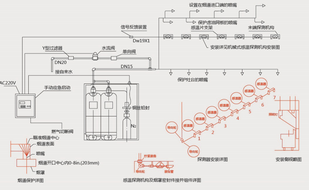 普通的滅火系統(tǒng)(水噴淋、氣體等)是按建筑面積或保護區(qū)容積來確定系統(tǒng)的大小,而廚房設(shè)備滅火系統(tǒng)是按規(guī)范所指的被保護對象所需噴頭的數(shù)量來確定系統(tǒng)的多少。目前,一套單瓶組自動滅火系統(tǒng)載荷的噴頭數(shù)量不超過13個,感溫易熔金屬拉索釋放器最多5只,灶臺保護最大長度為6米,煙罩最大保護長度為6米;雙瓶組自動滅火系統(tǒng)載荷的噴頭數(shù)量不超過20個,灶臺保護最大長度為12米,煙罩最大保護長度為12米。