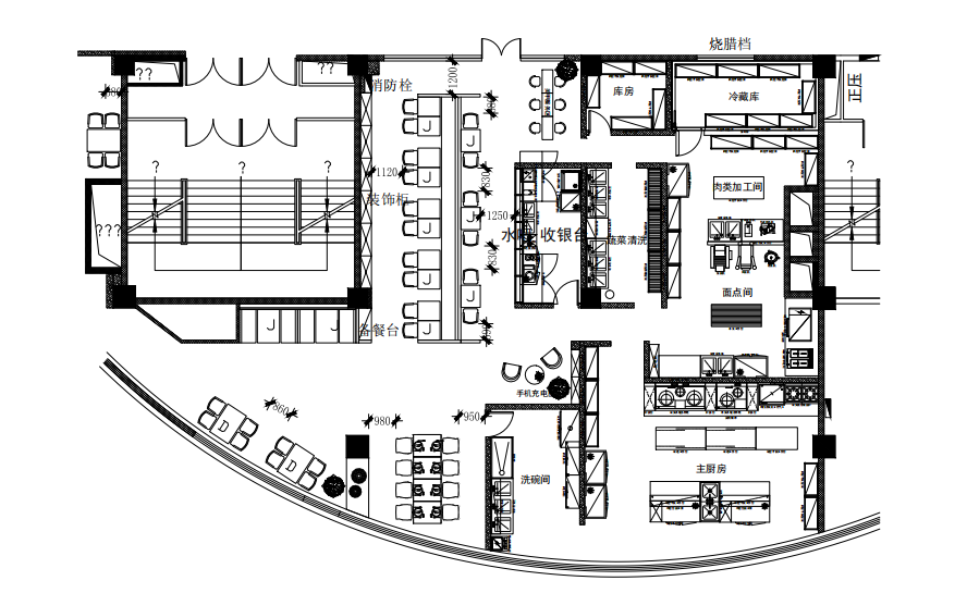 使用的灶具少,灶具主要是用大鍋灶煮面、熬粥,只需一兩眼炒灶用來(lái)制作主食配料,或用來(lái)煮零點(diǎn)的面條、餃子;使用的機(jī)械設(shè)備多,如和面機(jī)、壓面機(jī)、包子機(jī)、菜焰機(jī)、攪拌機(jī)等;蒸、煮、烤、炸、煎設(shè)備用得多,蒸飯柜、夾層鍋、烤箱、電炸 鍋、電餅鐺等;主食加工間與副食加工間特點(diǎn)不同,主食的米飯、饅頭、包子、餃子等食品大多是批量制作,批量蒸煮生產(chǎn)。所以,除煎炸食品外,生制與熟制可以分開(kāi)區(qū)域設(shè)置。熟制區(qū)需要出餐臺(tái),生制區(qū)需要機(jī)械設(shè)備、工作臺(tái)、及原料運(yùn)送,傳餐通道要有一定的寬度,通道要設(shè)置合理。由于經(jīng)營(yíng)方式、餐品類(lèi)別、加工工藝、出餐產(chǎn)量大小差異較大,主食加工間布局與飯店廚房設(shè)計(jì)自有特點(diǎn)。