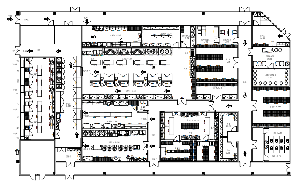把餐飲部分的建筑平面圖交給廚房設(shè)計部門進(jìn)行廚房布局方案設(shè)計。此時,建筑設(shè)計部門還沒有開始廚房的水電、排煙等輔助設(shè)施的設(shè)計。廚房布局設(shè)計方案細(xì)化了廚房規(guī)劃設(shè)計,可以明確廚房排煙、水電、熱源等必備設(shè)施的設(shè)計參數(shù)。如排煙管道的位置、數(shù)量、截面積、水的流量、走向、供電的電容、線路等方面,建筑設(shè)計部門應(yīng)做到心中有數(shù),設(shè)計時就會得心應(yīng)手。