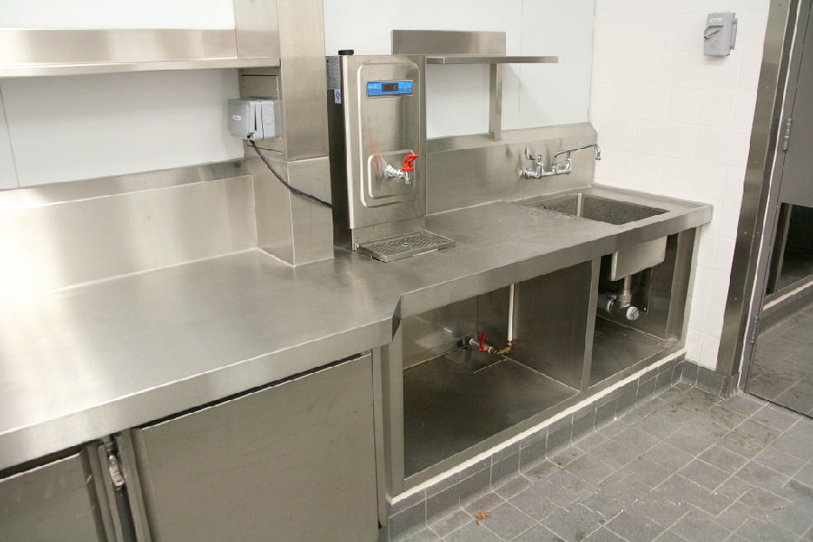 依然是一流的現(xiàn)場無縫焊接工藝,臺面非常平整,對土建(地臺施工),現(xiàn)場焊接工藝,調(diào)理臺的制造工藝要求非常高。工作臺的背板用大弧度L型設(shè)計,避免藏污納垢,容易清洗。