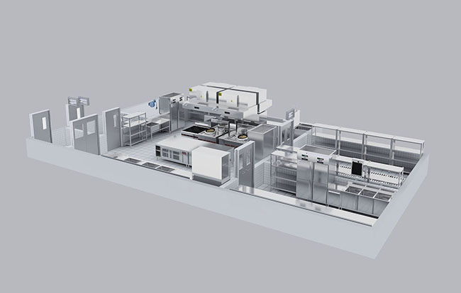 工藝需要專用設(shè)備,還需要滿足功能需要的配套設(shè)備。在大多情況下,經(jīng)營(yíng)者只會(huì)提出所需要的主要設(shè)備,如爐具、蒸柜等。還有一些必需的通用設(shè)備不能一一列出來,如水池、冰柜、調(diào)料臺(tái)、工作臺(tái)等。這就需要設(shè)計(jì)人員結(jié)合實(shí)際情況,把需要的設(shè)備設(shè)計(jì)到位,并向經(jīng)營(yíng)者說明。在各功能區(qū)域內(nèi)配齊設(shè)備,也就是完成加工工序所需要的冷凍、冷藏、洗、臺(tái)案、車架、等多種設(shè)備。例如,所有加工工作離不開洗、刷、涮和案面上加工操作,臺(tái)案、水池就是各工作間要素設(shè)備。工作間內(nèi)要配齊設(shè)備,盡量不要跨工作間去完成加工工序。例如,主食加工間到副食加工間去淘米,煮面條,就跨越了工作間,為實(shí)際操作帶來了不便。各種要素設(shè)備要盡量齊全,并且根據(jù)實(shí)際需要確定種類、型號(hào)、數(shù)量。