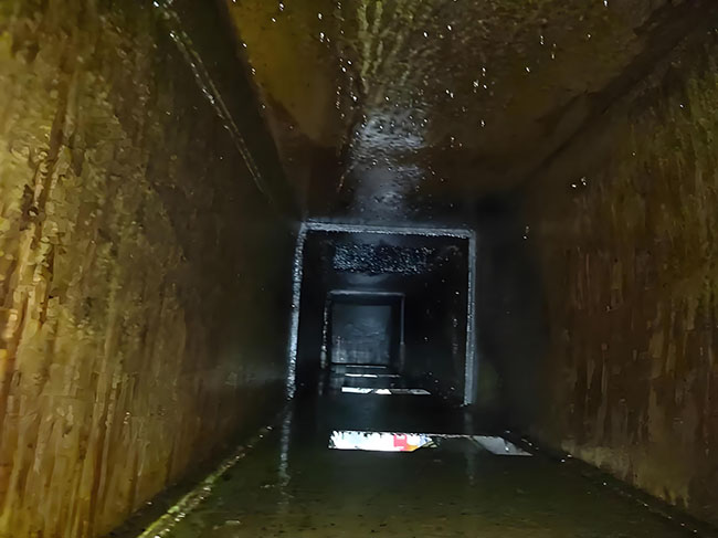 4.高壓清洗機進水置于含有保持性除油劑的大塑料桶內(nèi),出水槍(水槍)部分改造為旋轉(zhuǎn)噴頭。為了防止因管道壓力過大造成噴頭不穩(wěn)定,將其下面的重物懸置平衡,然后放入立式廚房排煙管中,開動除油劑,使除油劑噴到廚房排煙管內(nèi)壁,從上到下,直至一層??筛鶕?jù)清洗需要調(diào)節(jié)壓力。大約浸泡30分鐘左右,在化學力得作用下,油垢自行脫落,反復(fù)沖刷多遍,再用清水沖洗。由于各管內(nèi)部中間有隔管,故每條管要進行多次清潔。