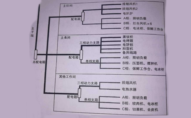 一般酒店的廚房供電系統(tǒng)用電負(fù)荷分為單相負(fù)荷和三相負(fù)荷。單相負(fù)荷主要為照明電源、單相插座以及其他額定電壓為220V的電器供電。其特點(diǎn)為用電負(fù)荷的額定電壓均為單相220V.若均勻分布到A、B、C三相,這類負(fù)荷也叫做相負(fù)荷。一般分為兩個獨(dú)立的系統(tǒng):照明系統(tǒng)和22V單相負(fù)荷動力系統(tǒng)。380V三相負(fù)荷分別供電到各個工作間。額定電壓為380V的動力支路主要供蒸飯柜、傳菜電梯、電熱開水器、排煙風(fēng)