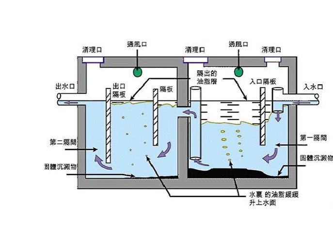 廚房隔油池也稱為油水分離池,利用各種廢棄物的密度、體積大小的不同特點加以分離。流程機理為:含有污油等廢棄物的污水從排水管流入濾篩筐,先除去較大的菜葉、食物殘渣等固態(tài)廢棄物,泥沙、碎末等細小廢棄物在沉降室進行沉淀,固液分離;污油浮于水面,隔油板阻擋浮油,經(jīng)初級、次級、三級分離室進行大廢棄物、小廢棄物、油、水分離,清除易腐爛的有機固體和液體廢棄物,使污水凈化排放。浮油在隔離室的上部,大廢棄物在濾篩筐中,沉淀物在池底,需要人工定期清理。