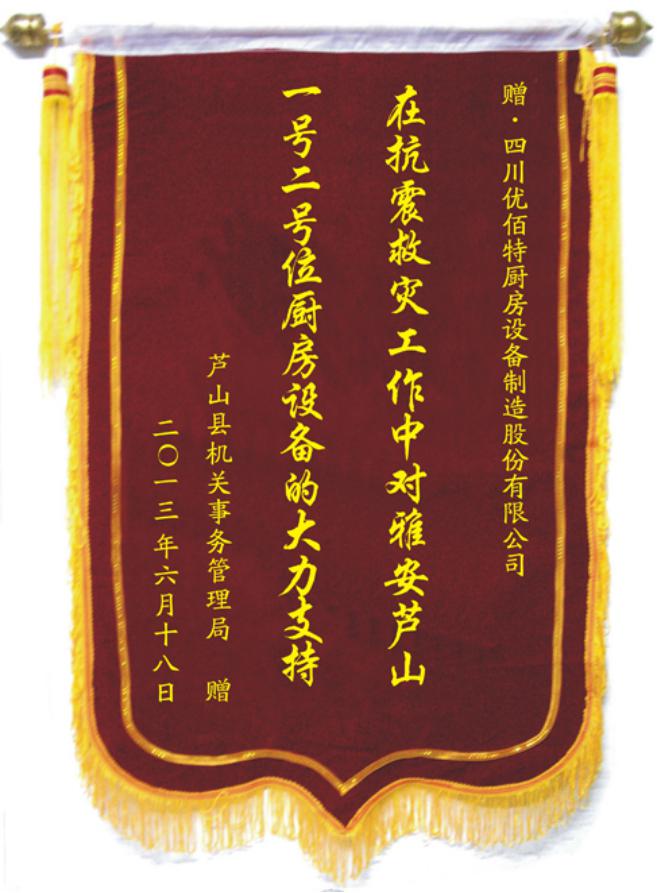 我公司2013年雅安蘆山地震中援建廚房設(shè)備,獲蘆山縣贈錦旗